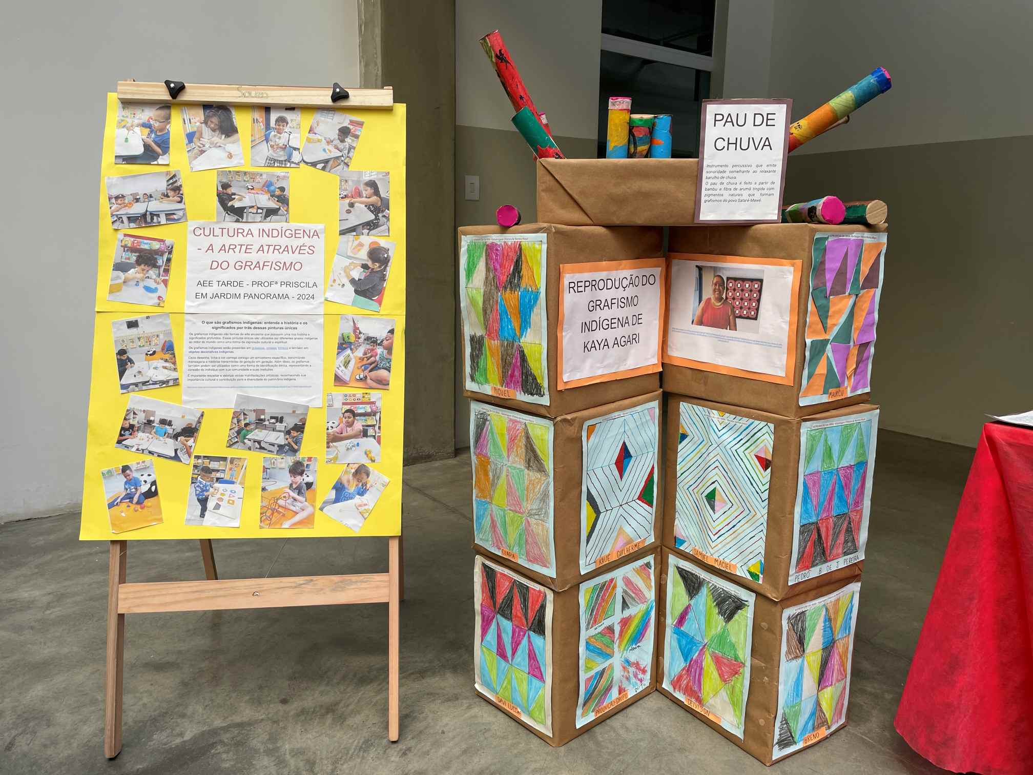 Priscilla Pereira, que leciona na E.M Jd. Panorama, fortaleceu o vínculo com a arte dos povos originários trabalhando o projeto ‘Cultura Indígena: A arte através do grafismo’ no núcleo de atendimento especializado. “O objetivo era eles [os alunos] conhecerem mais sobre o grafismo [indígena]. Então, conseguimos reproduzir o grafismo em instrumentos musicais, como no pau de chuva e no maracá, e na arte em cerâmica, que, pelo toque com a argila, ajudou a acalma-los”, comentou Priscilla.